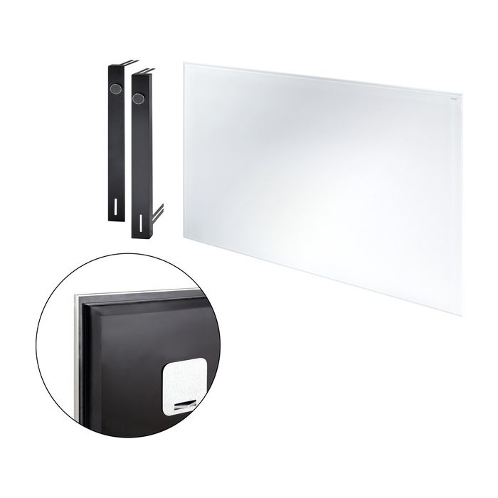 По высоте и ширине панель перекрывает размеры металлической рамки примерно на 15 мм, закрывая края обоев или крашенные кромки стен. Комплект состоит из стеклянной панели и регулируемых по глубине держателей с магнитами.